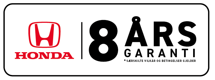 Garantien gjelder i 5 år (3 års Europa-garanti pluss 2 års utvidet Honda-garanti for biler solgt av Honda Motor Europe LTD Norge) eller 100 000 km, avhengig av hva som først inntreffer. Det betyr at vi vil reparere eller erstatte eventuelle material- eller produksjonsfeil kostnadsfritt. Garantien kan utvides til opptil 8 år eller 100.000 km, forutsatt at kjøretøyet vedlikeholdes i henhold til Hondas anbefalte vedlikeholdsplan hos en autorisert Honda-forhandler eller et autorisert servicesenter. Ytterligere unntak kan gjelde i løpet av forlengelsesperioden (se Terms & Conditions for detaljer). ***